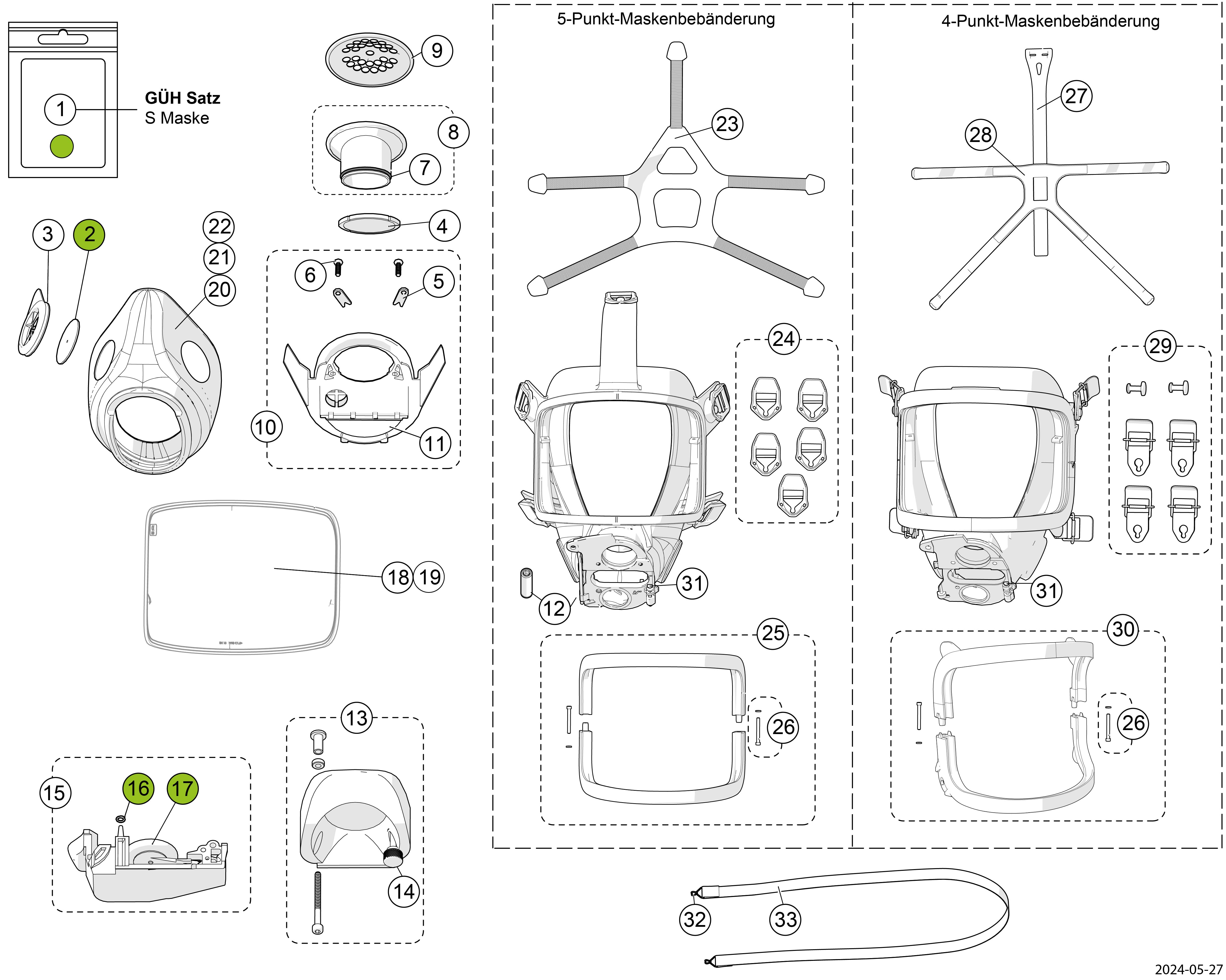 Es gibt auch eine Version, die mit Helmadapter kompatibel ist, ausgestattet mit einer 4-Punkt-Maskenbebänderung und einem oberen Riemen. Diese Version ist in Standardgröße erhältlich. Bei der Bestellung dieser Maskenversion erfolgt die Lieferung einschließlich Maskenbebänderung, Schnallen und Tragriemen. Wird sie jedoch zusammen mit dem Artikel „Vor-Lieferung-montierte-Helmadapter” (siehe nachfolgend „Zubehör”) bestellt, wird sie ohne Maskenbebänderung, Schnallen und Tragegurt geliefert.