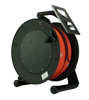 The cable reel is made from plastic and rubber. The reel is fitted on the back with a multipin bulkhead connector for quick connection of a patch cable to the surface control box.