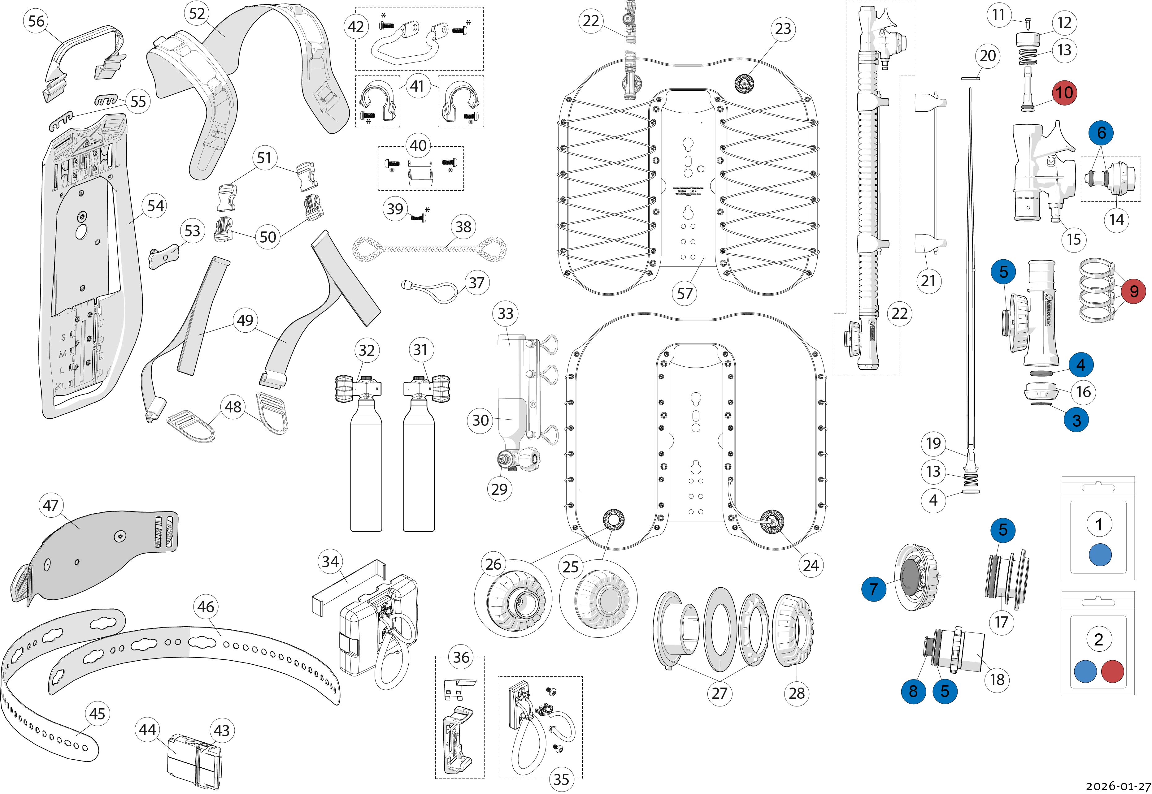 Die Luftversorgung besteht aus einem neuen Flaschenpaket mit Vollverbundflaschen mit einem neu entwickelten Schnellverschluss zum Tragegestell / BC, hier können Sie mehr über das Paket lesen.